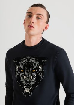 ملابس Antony Morato سويت شيرت بقصة عادية مصنوع من مزيج القطن مع طباعة النمر حبر أزرق رجال JVZ2250