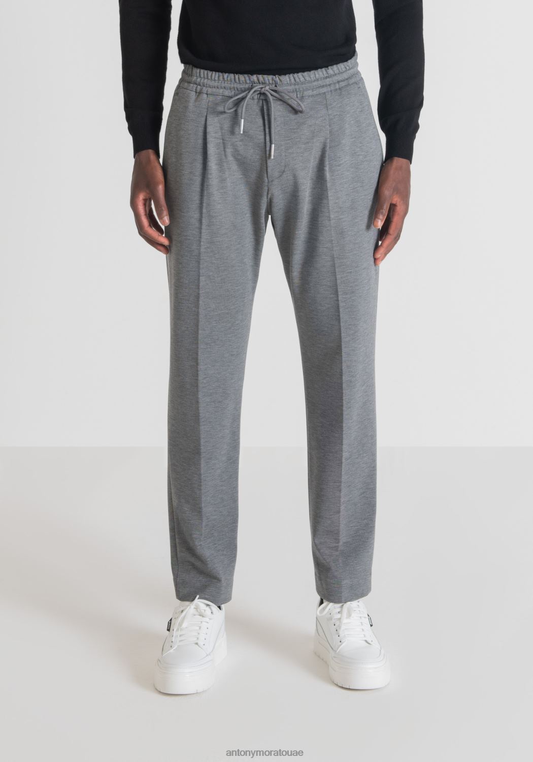 بنطال بقصة عادية مع حزام خصر مطاطي، قابل للتعديل برباط. مصنوع من مزيج الفيسكوز الناعم والمطاط، ويتميز بجيوب مائلة في الأمام وجيوب مبطنة مع أزرار مرئية في الخلف. تكشف تفاصيل الطيات المركزية عن الروح الكلاسيكية لنموذج مريح للغاية، تم تحديثه بما يتماشى مع رموز الأسلوب المعاصر لأنطوني موراتو.
