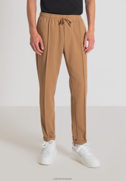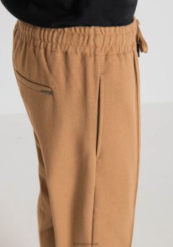 بنطال رياضي بقصّة جزرة مصنوع من نسيج قطني مضلع ناعم ومطاط. تم تحسين الصورة الظلية بعناصر رياضية مثل حزام الخصر المرن مع الرباط وتفاصيل مستوحاة من الملابس مثل التجعد المركزي والالتفاف في الجزء السفلي من الساق. إنه نموذج يلعب بأساليب مختلفة، ويفسر مسار البحث والابتكار الذي ميز أنتوني موراتو دائمًا.