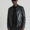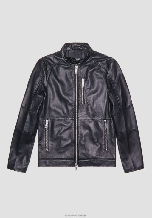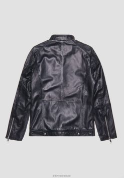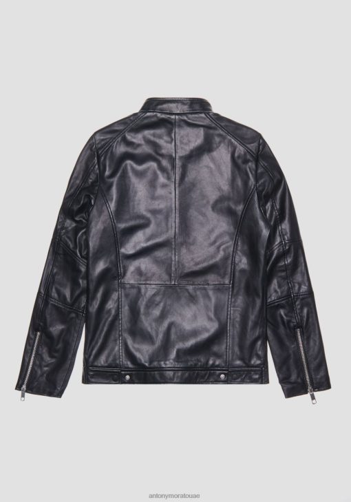 ملابس Antony Morato سترة راكب الدراجة النارية ذات المقاس النحيف من الجلد الطبيعي مع ياقة كورية أسود رجال JVZ224